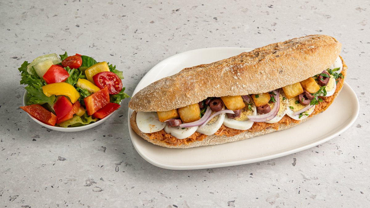 ממרח טונה תוניסאית, פרוסות ביצה קשה, קוביות תפוח אדמה, בצל סגול, טבעות זיתים שחורים, טחינה אסלית ועשבי תיבול קצוצים. מוגש בלחם לבחירה לצד סלט אישי | ללא גלוטן