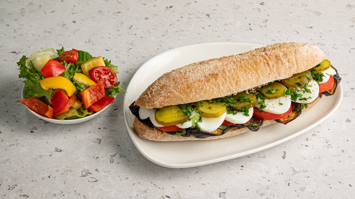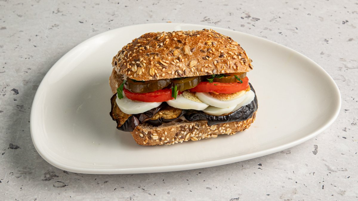 טחינה אסלית, פרוסות חציל קלוי, פרוסות ביצה קשה, מלפפון חמוץ ועשבי תיבול קצוצים. מוגש בלחם לבחירה לצד סלט אישי | ללא גלוטן