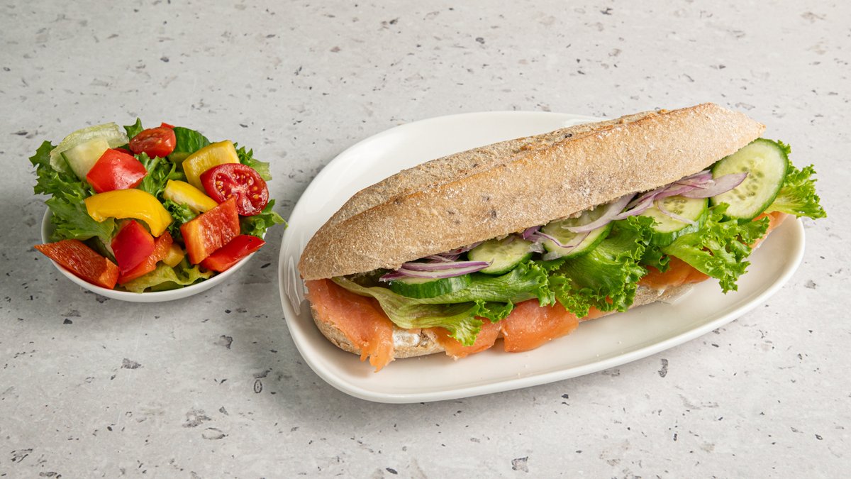 גבינת שמנת, פרוסות סלמון מעושן, בצל סגול וחסה קצוצה. מוגש בלחם לבחירה לצד סלט אישי