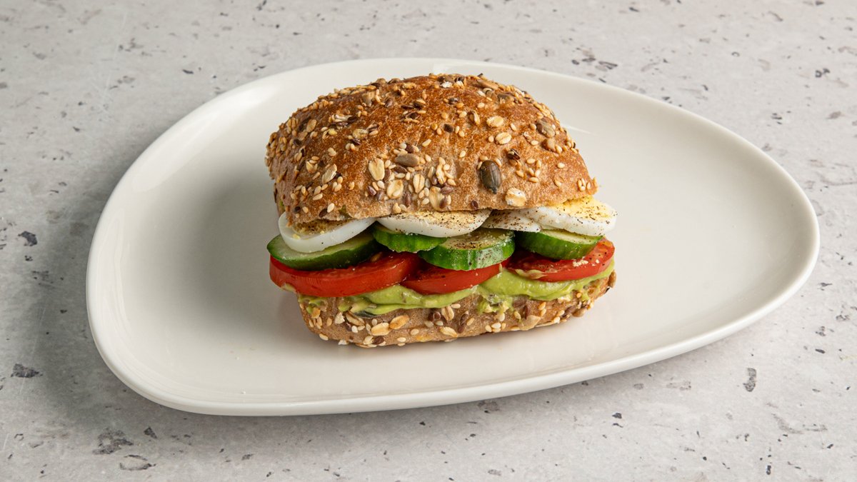 ממרח אבוקדו, פרוסות מלפפון, פרוסות עגבנייה, פרוסות ביצה קשה ובצל ירוק קצוץ. מוגש בלחם לבחירה לצד סלט אישי | ללא גלוטן