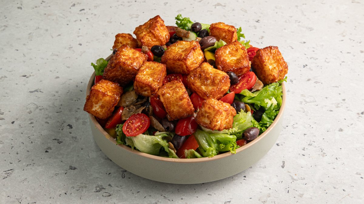 קוביות חלומי מטוגנות, חסה קצוצה, גזר מגורד, שרי, צנונית, מלפפון ירוק, גמבה צבעונית, מיקס זיתים ופטריות מוקפצות מוגש לצד לחם לבחירה, ויניגרט ישראלי ורוטב שמן זית לימון