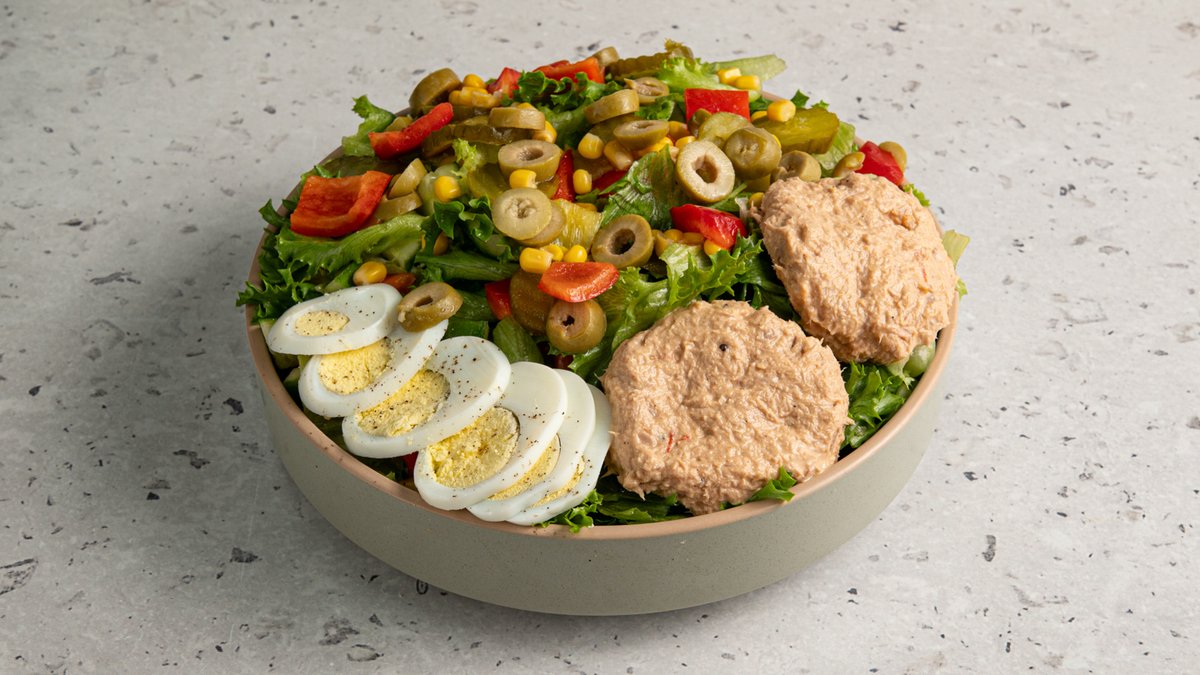 חסה, גמבה צבעונית ,מלפפון ירוק, מלפפון חמוץ, תירס, זיתים ירוקים, ביצה קשה וטונה