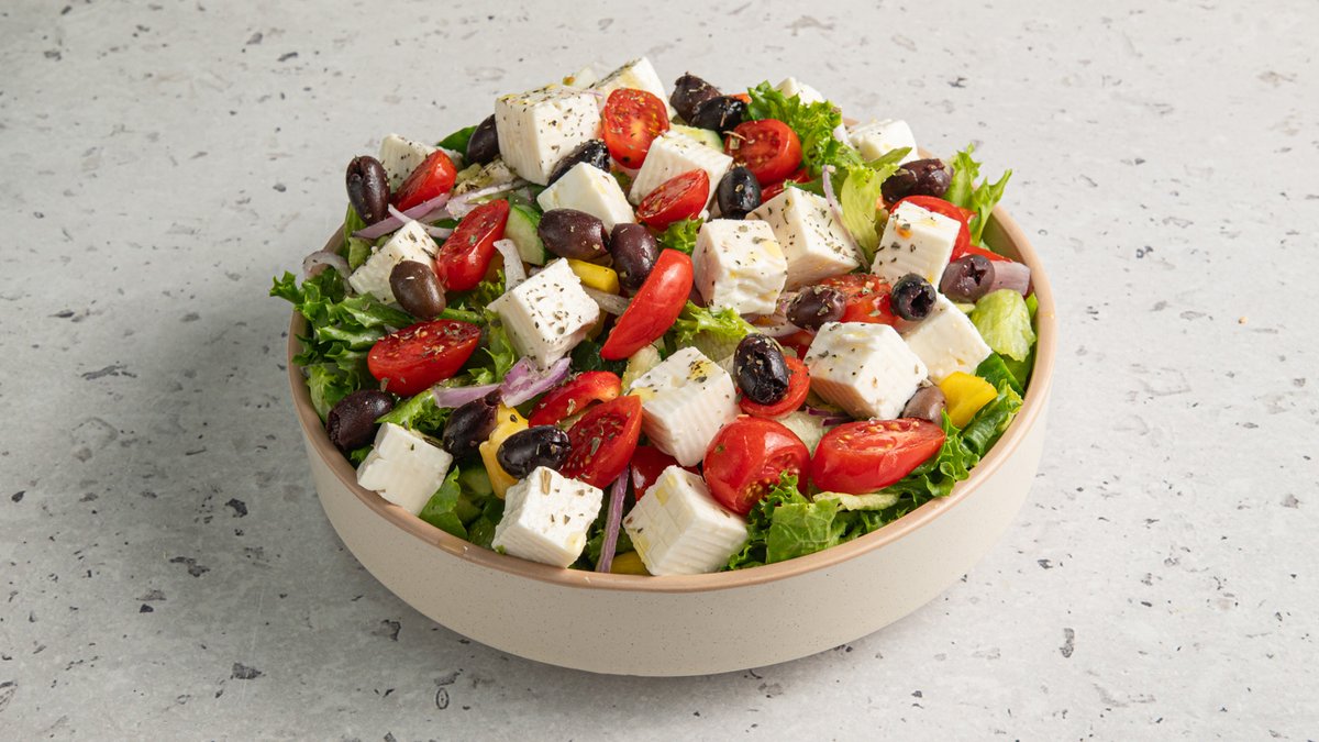 חסה, גמבה צבעונית, מלפפון ירוק, בצל סגול, זיתי קלמטה, עגבניות שרי ובולגרית 5%
