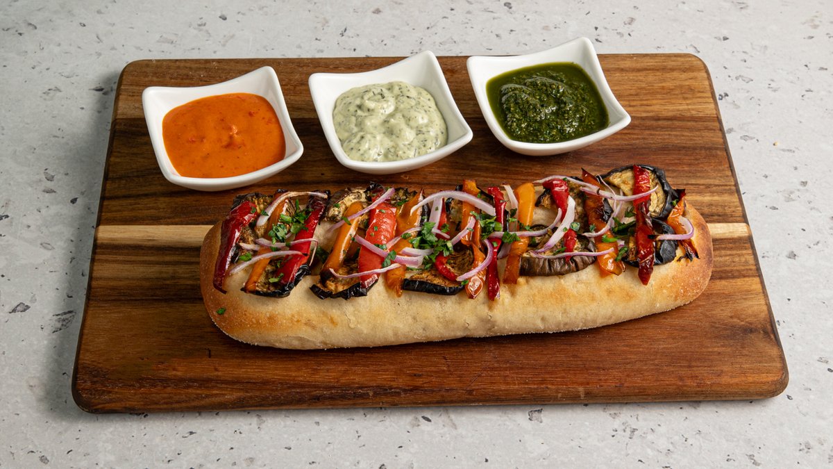 פוקאצ'ה עשויה בתנור אבן עם חציל קלוי, פלפל קלוי, בצל סגול ופטרוזיליה קצוצה מוגש עם מטבלים