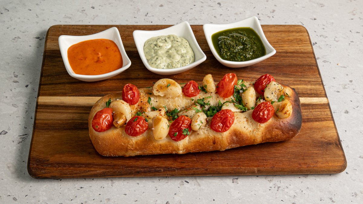 פוקאצ'ה עשויה בתנור אבן עם שום קונפי, שרי צלוי ופטרוזיליה קצוצה מוגש עם מטבלים