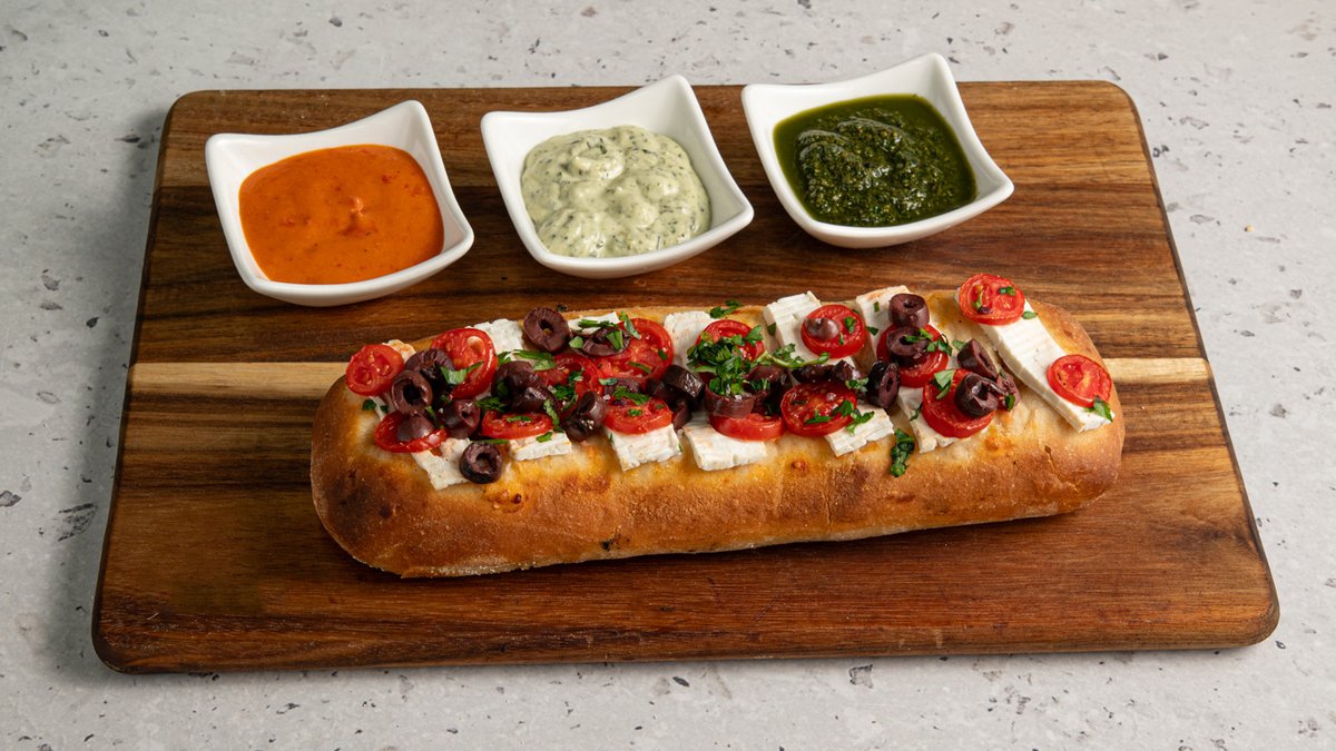 פוקאצ'ה עשויה בתנור אבן עם בולגרית 5%, זיתי קלמטה, עגבניה ופטרוזיליה קצוצה מוגש עם מטבלים