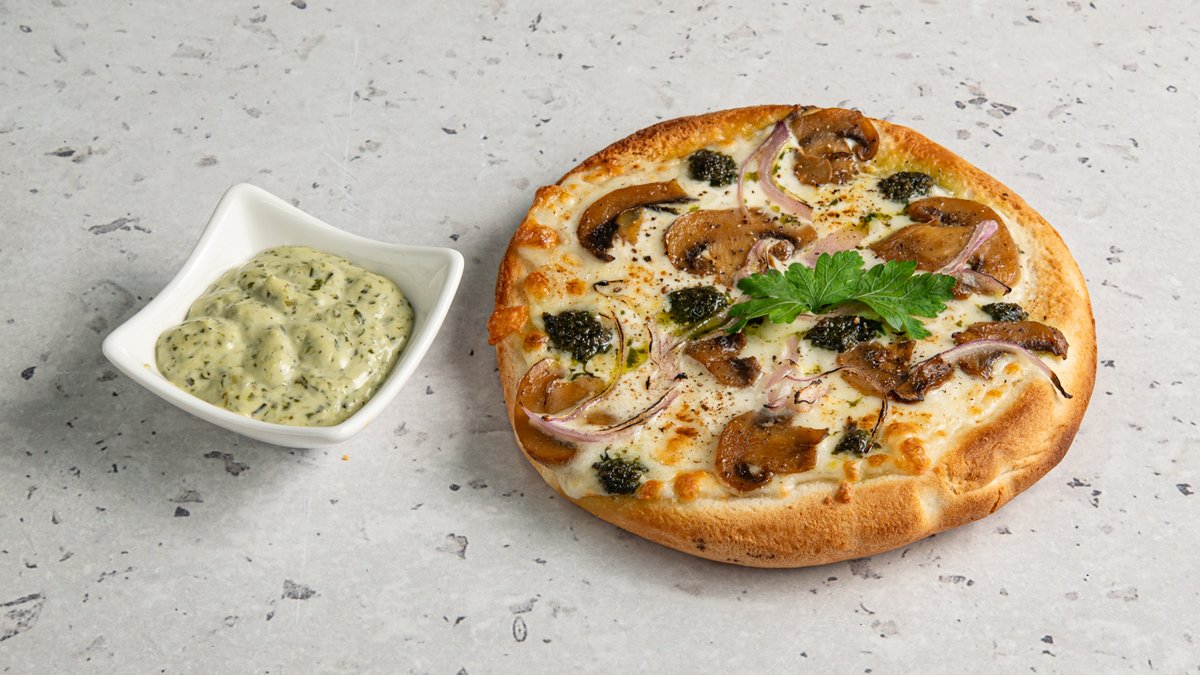 ממרח פסטו, גבינה צהובה, גבינת שמנת, חלומי, פטריות פורטובלו ובצל סגול מוגש לצד סלט אישי, רוטב שום ורוטב אלף האיים