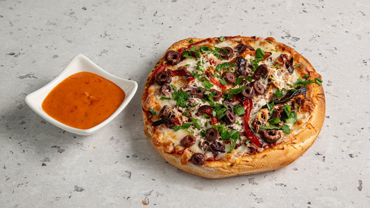 גבינה צהובה, טבעות זיתים ירוקים, פרוסות עגבנייה ורוטב פיצה. מוגש לצד סלט אישי, רוטב שום ורוטב אלף האיים