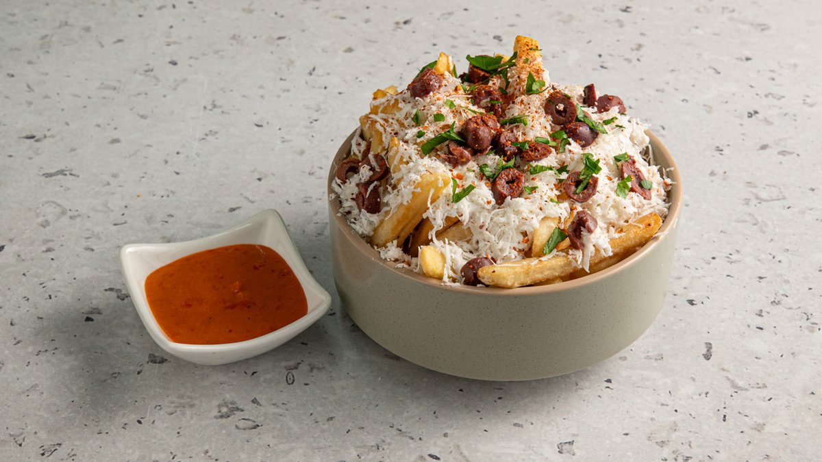 צ׳יפס עם בולגרית, זיתי קלמטה וירק קצוץ מוגש עם רוטב הבית בצד