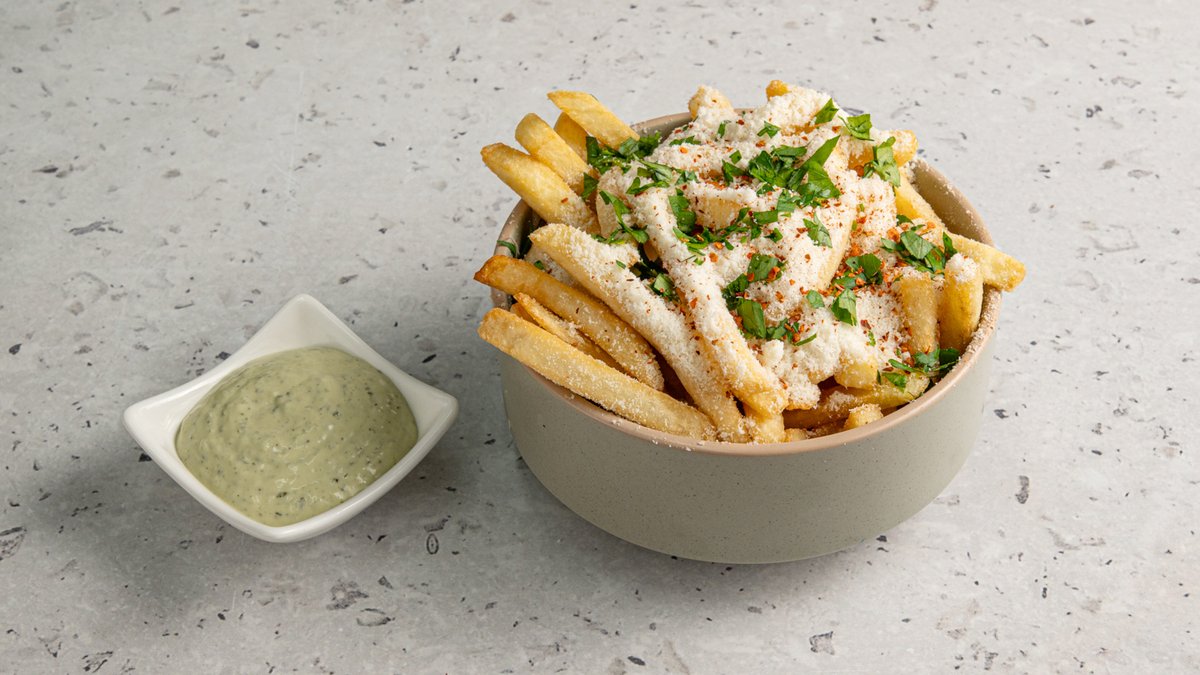 צ׳יפס עם פרמז׳ן, פלפל שאטה גרוס וירק קצוץ מוגש עם רוטב הבית בצד