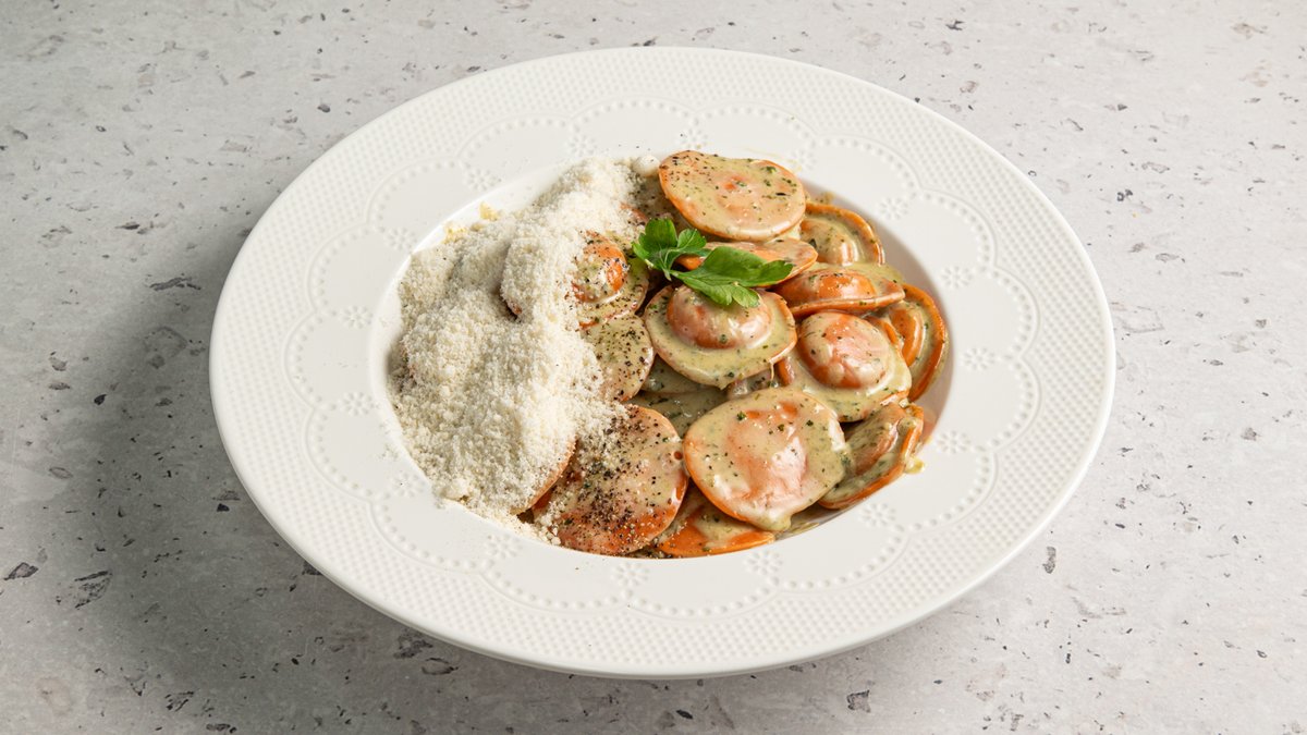 רביולי גבינה ברוטב עגבניות נפוליטני וחמאה חומה, גבינת פרמז'ן, שאטה גרוס ופטרוזיליה