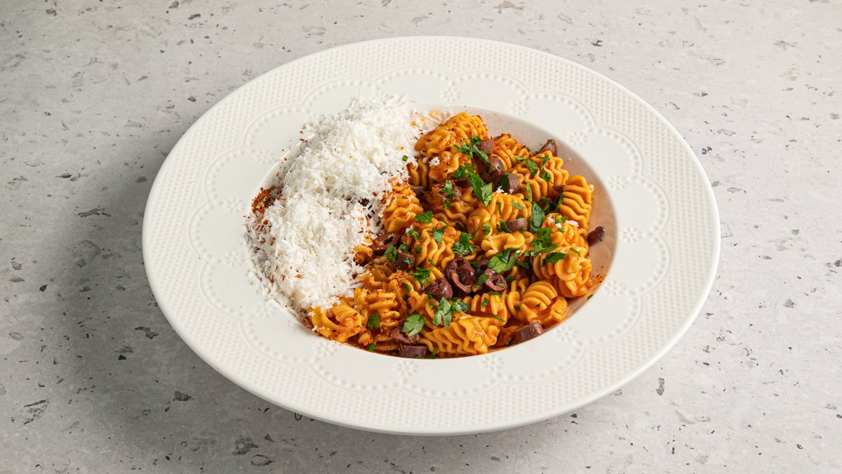 פסטה רדיאטורי ברוטב עגבניות נפוליטני, זיתי קלמטה, גבינה בולגרית מגורדת ופטרוזיליה