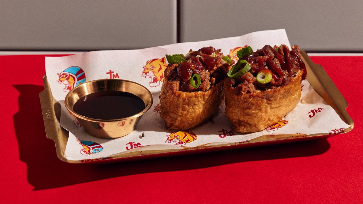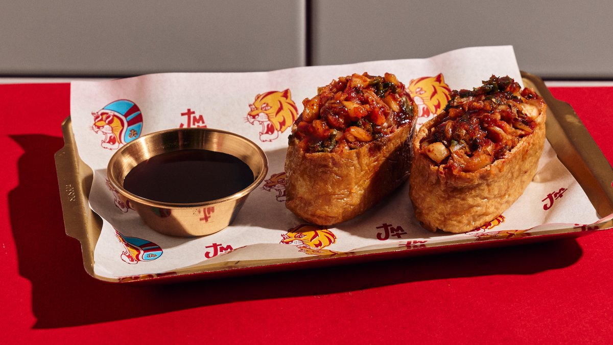 בלילה פריכה וזהובה מטוגנת לשלמות במילוי נקניקיית חזיר עם נגיעות גבינת גאודה וטימין, פסי איולי גוג'וג'אנג ורוטב סאמג'אנג (ברביקיו קוריאני) שימו ❤️ - מומלץ לחמם את המנה ל -2 דק' בתנור שחומם מראש ל- 200 מעלות ולהוסיף את הרטבים לאחר מכן