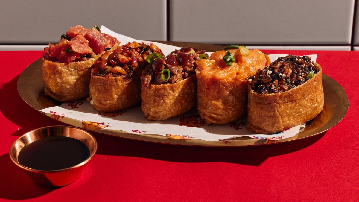 שרימפס טמפורה, סלמון, בטטה, אבוקדו, מלפפון, סלק, חסה, איולי גוצ'וג'אנג ורוטב סאמגאנג'