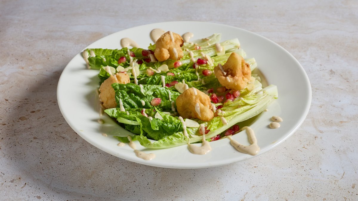 לבבות קיסר עם הרוטב קיסר שלנו, כרובית מטוגנת, שקדים, רימון ופרמזן מלמעלה