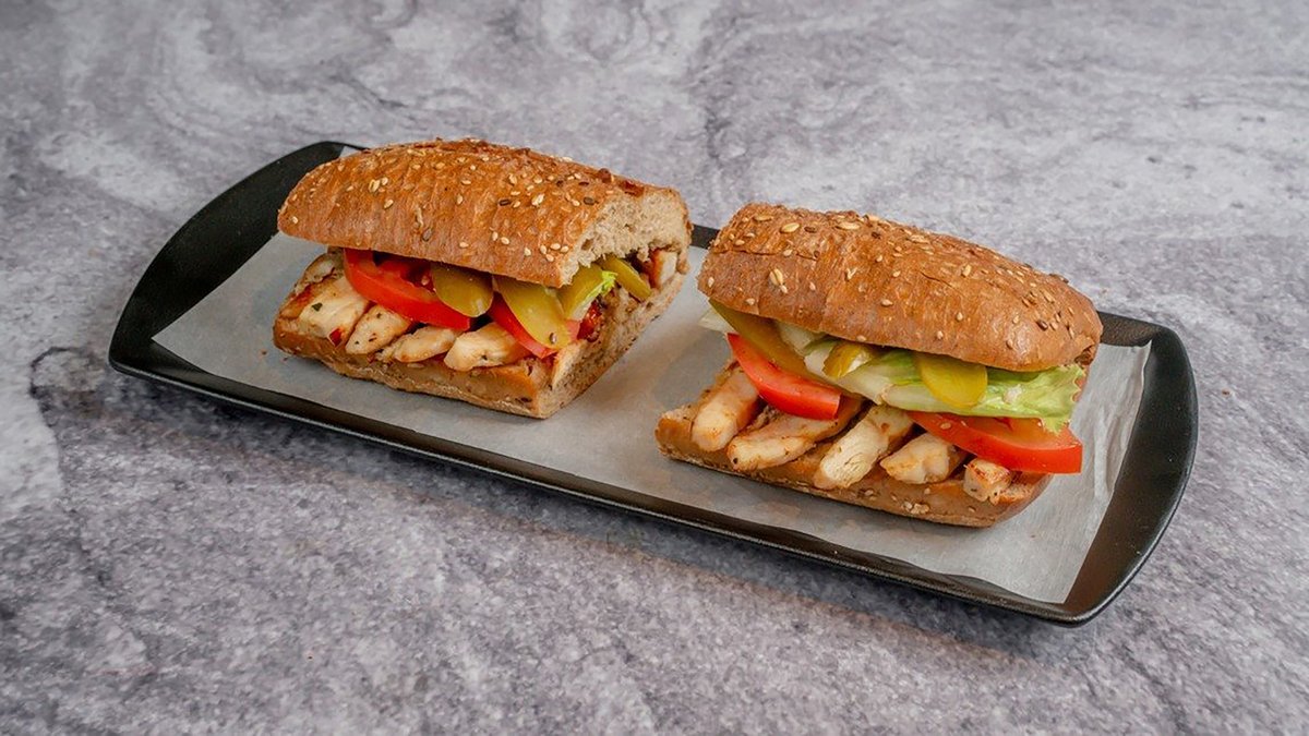 רצועות רוסטביף בלחמניה עם רוטב צ׳יפוטלה, בצל מקורמל, חמוצים וארוגולה