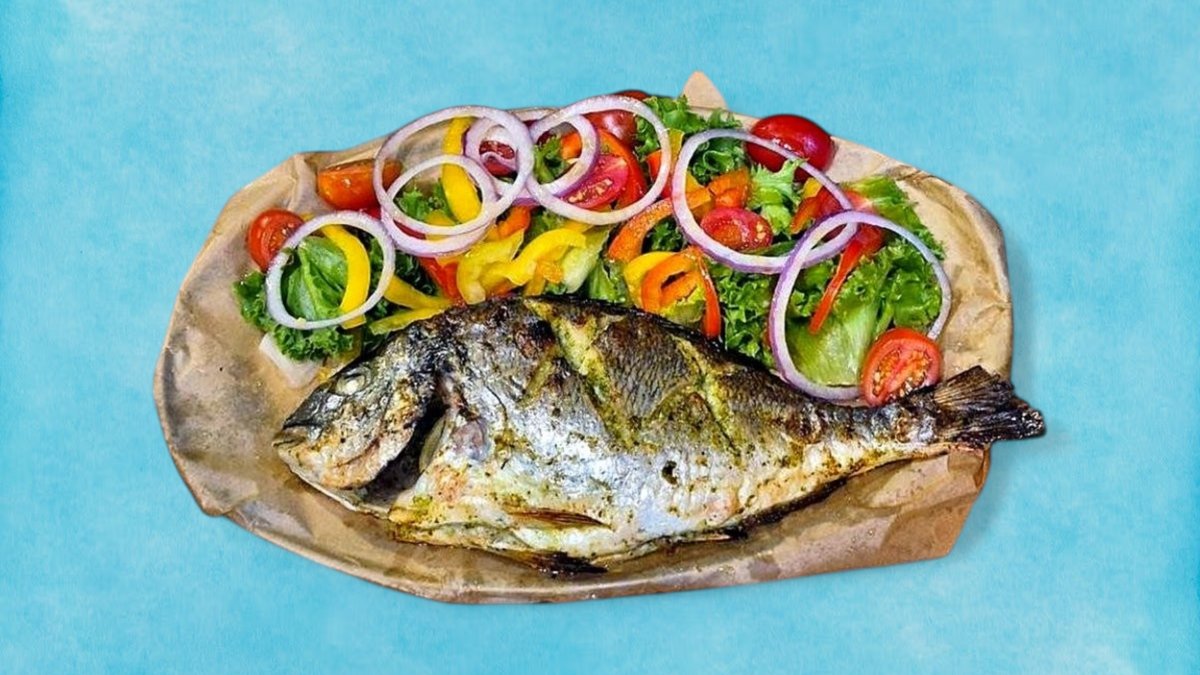 מנה של פילה דג בס ים עסיסי, לצד סלט טרי