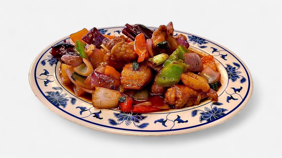 נתחי עוף/טופו מעושנים וצלויים. פלפלים בצלים וצ׳אטני כוסברה. מוגש עם אורז