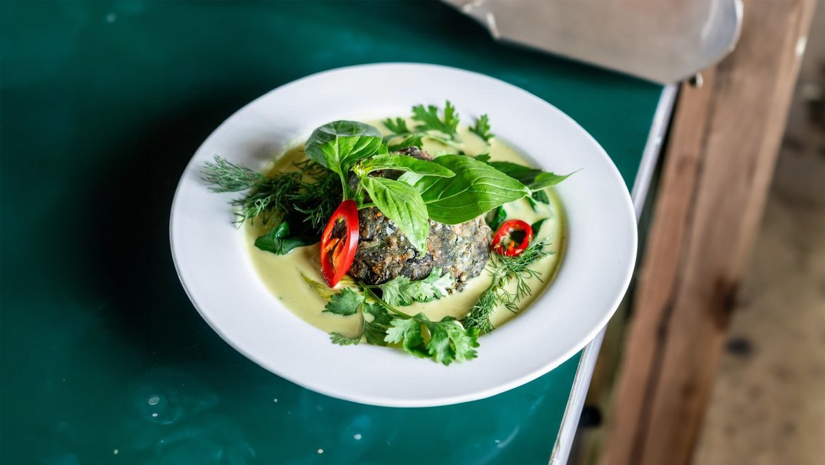 ברוטב למון גראס ועלים ארומטיים. מוגש עם אורז