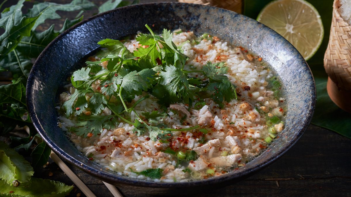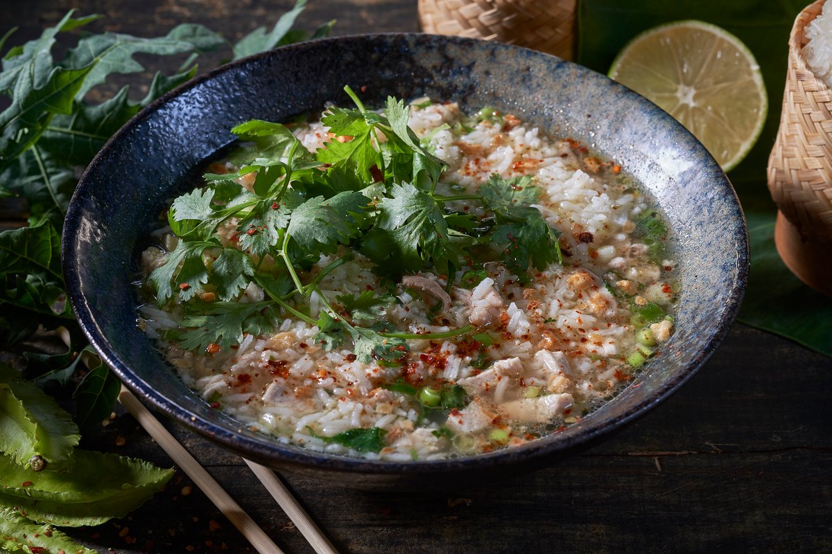 מרק אורז, פילה לברק, ג'ינג'ר,בצל לבן וירוק, שיטאקי, קריספי שום, כוסברה וצ׳ילי