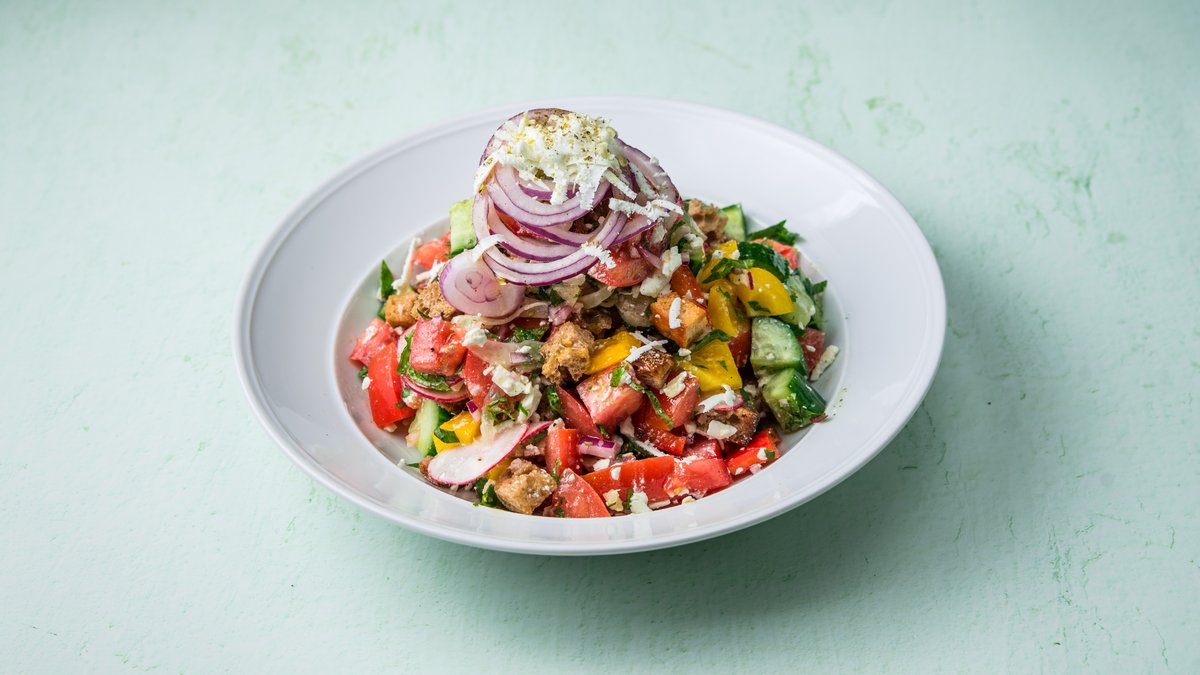 עגבניות, מלפפונים, פלפלים, חסה, בצל סגול, צנוניות, נענע, פטרוזיליה, קרוטונים, זיתי קלמטה, זעתר וגבינת פטה בשמן זית ולימון