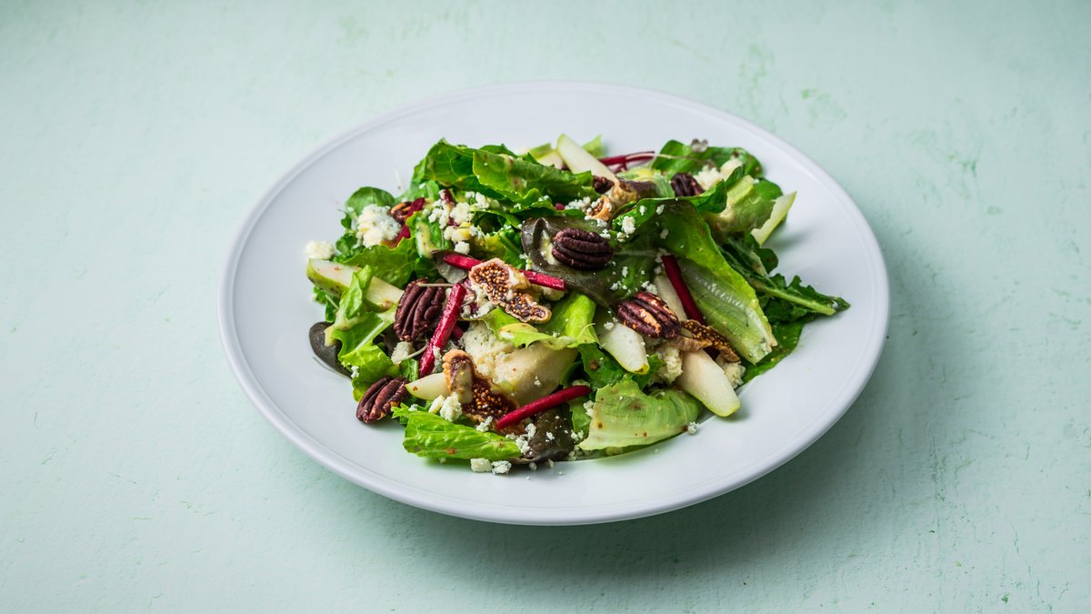 עלים ירוקים, רוקט, פלחי אגס, סלקים צלויים, דבלים, גבינה כחולה, אגוזי פקאן קלויים ברוטב וינגרט חרדל ודבש