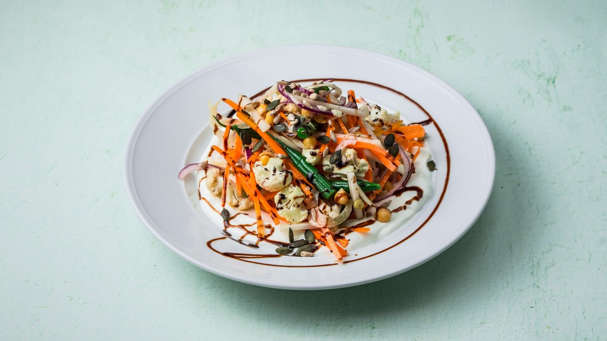 חזה עוף בגריל, גזר, כרוב לבן, נבטים, שעועית ירוקה, עגבניות שרי, בצל ירוק ועשבי תיבול ברוטב אסייאתי ושברי בוטנים קלויים. (ניתן להחליף עוף בטופו)