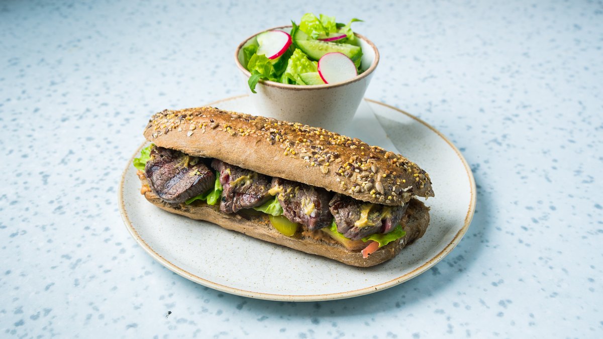 איולי שום, חסה, עגבניה, מלפפון חמוץ ובצל מקורמל מוגש עם סלט עלים/קצוץ