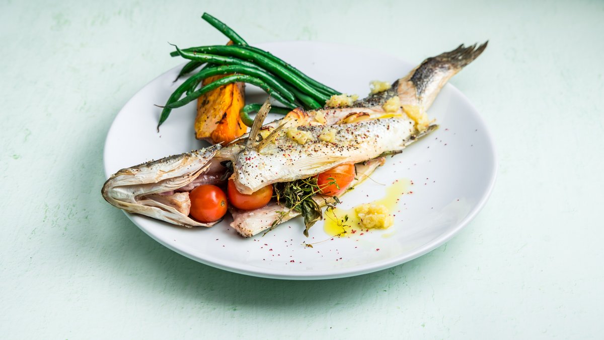 בתנור בשמן זית ועשבי תיבול עם בטטה צלויה, שעועית ירוקה וברוקולי