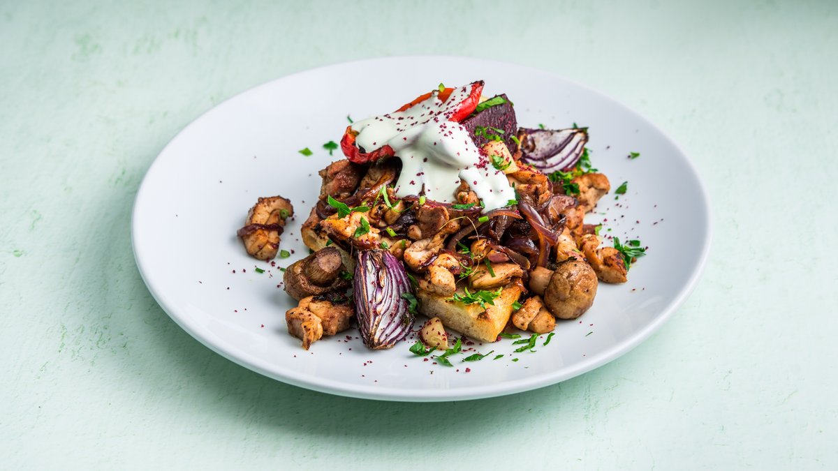 נתחוני פרגית בתערובת תבלינים ובצל מקורמל, על קרעי פוקאצ'ה, סלט עגבניות חרפרף, טחינה, יוגורט וטוגני הבית