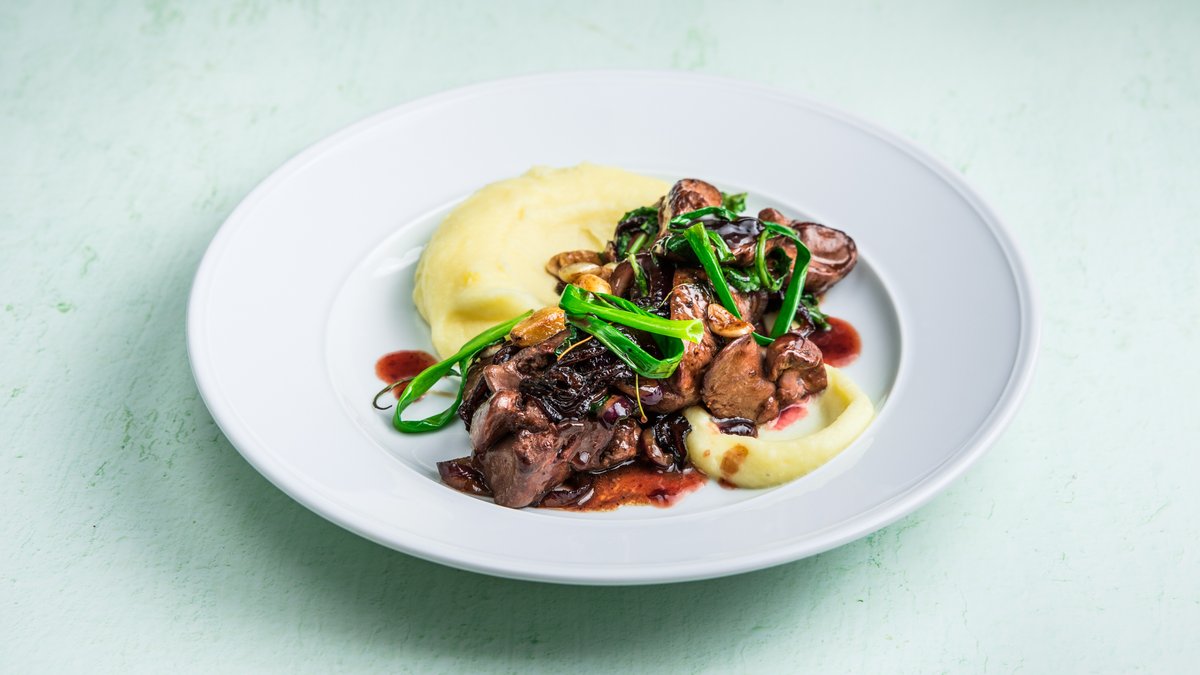 צלויים בגריל, על פירה בזיליקום ורוטב שמנת פלפל מוגש עם תוספת לבחירה