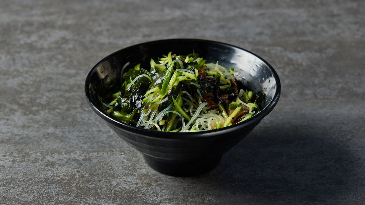 אצות וואקמה עם פטריות שיטאקה, אטריות שעועית ומלפפון ברוטב מעוטר בשומשום