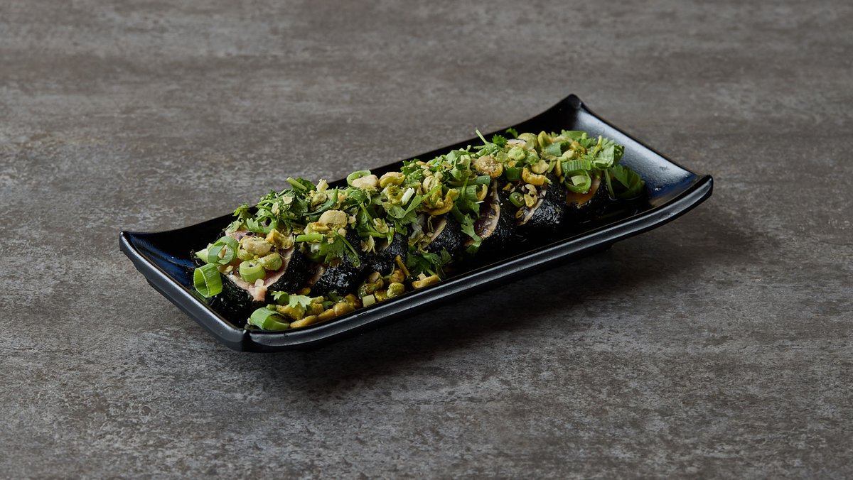 דניס קצוץ, עירית, בצל סגול ,צ'ילי וכוסברה בתחמיץ שמן שומשום ולימון