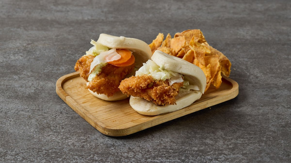 שתי לחמניות באן מאודות, במילוי סלמון/בקר/טופו/שניצל, איולי כוסברה וחמוצים יפניים (קימצ׳י) בתמונה - באן בקר. מוגש עם טוויל בטטה
