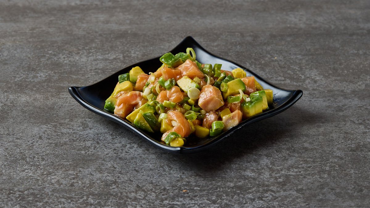 סלמון קצוץ, אבוקדו, בצל ירוק, בצל סגול, שמן שומשום ויוזו