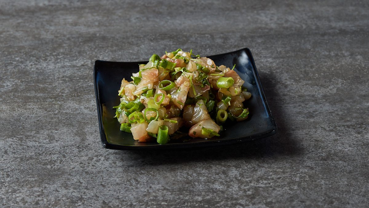 טונה קצוצה, פלפל אדום, בצל סגול, צ'ילי חריף, שמן שומשום וכוסברה, במרינדת יוזו