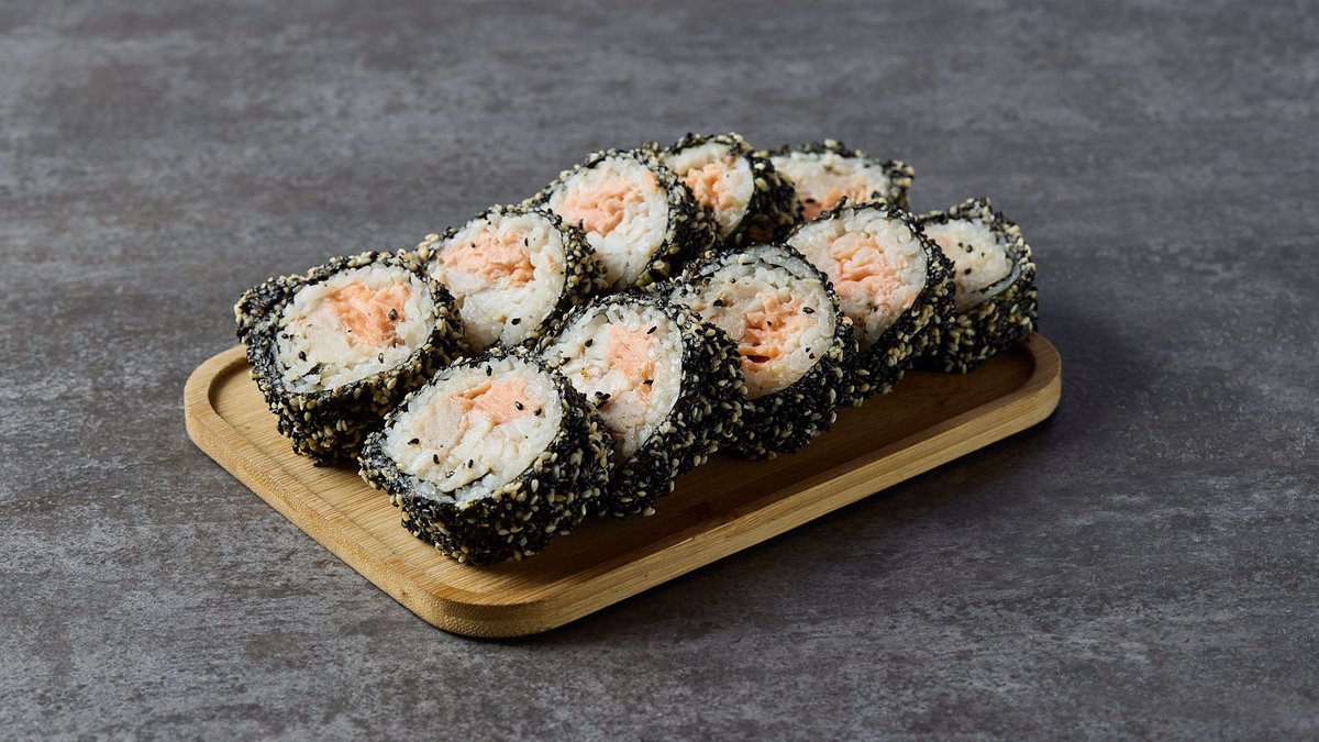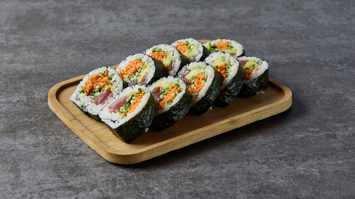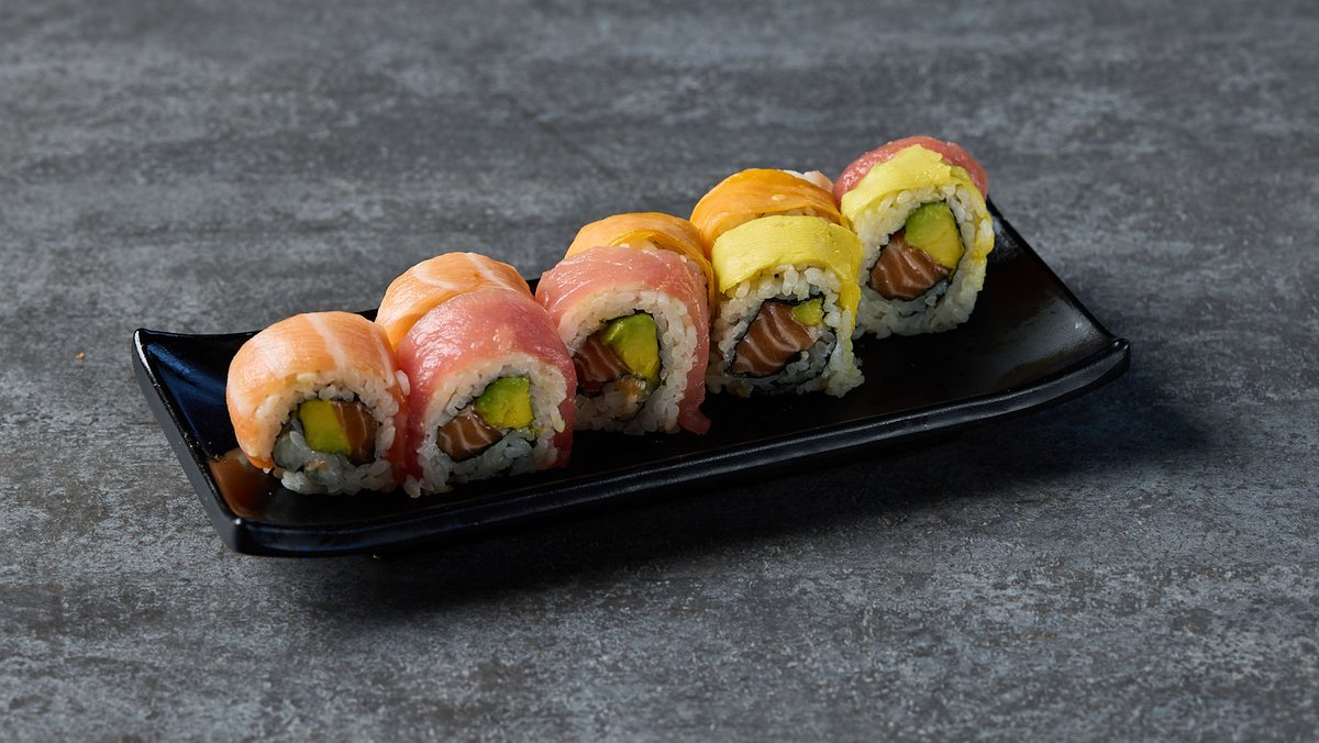 רול סלמון ואבוקדו עטוף בטונה אדומה, סלמון, בטטה ואבוקדו