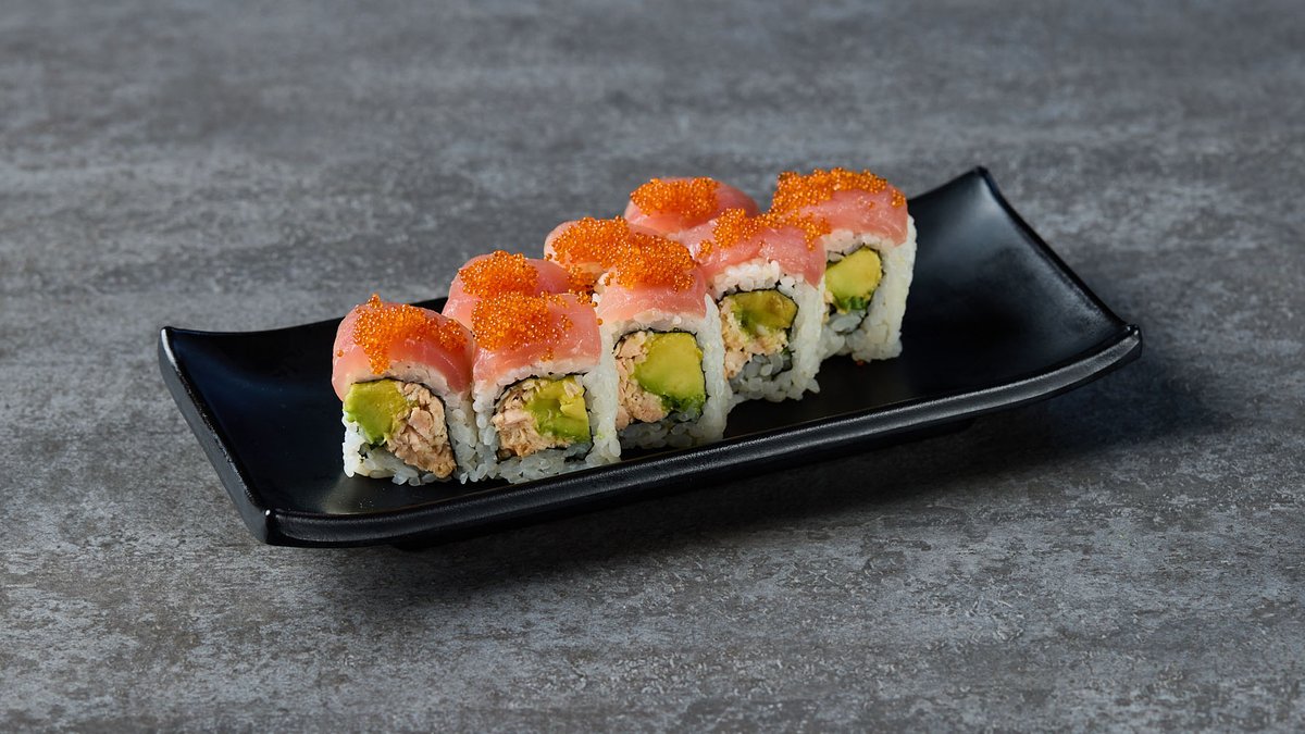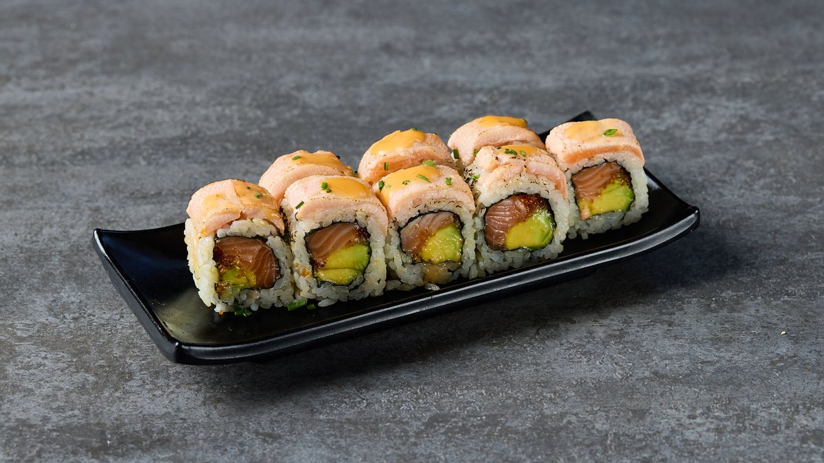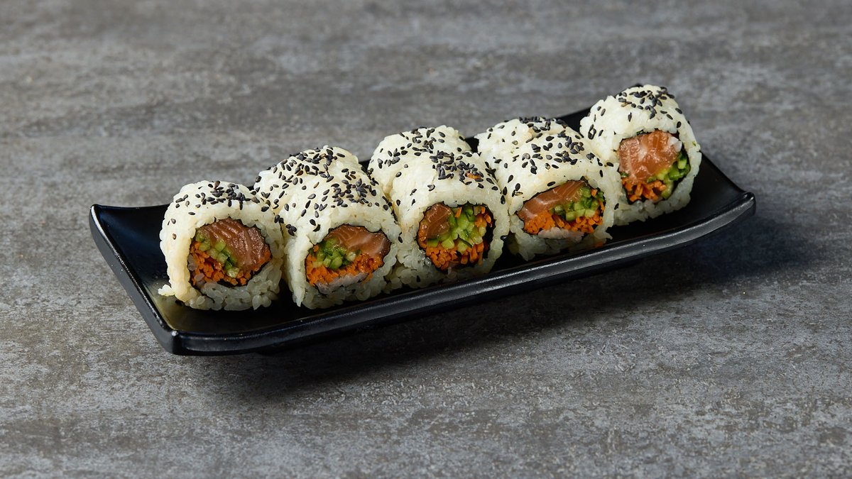 סלמון, אבוקדו, טוביקו ונגיעות וואסבי עטוף בסלמון צרוב, ספייסי מיונז ובצל ירוק