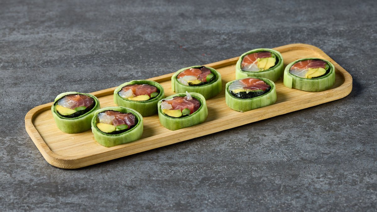 רול מלפפון ללא אורז במילוי דניס, טונה וסלמון וירקות