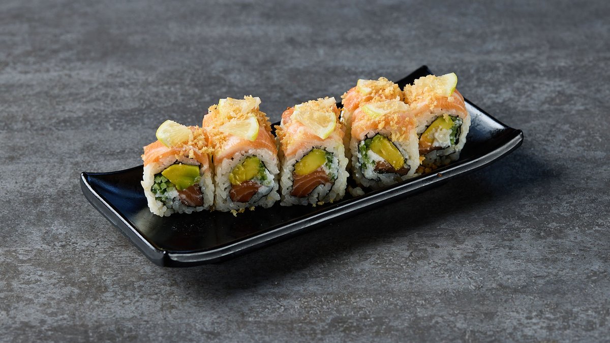 סלמון, אבוקדו ומלפפון ברוטב מיונז חריף במעטפת דניס ופלח לימון