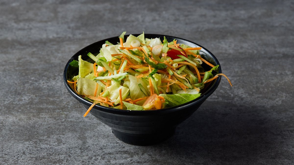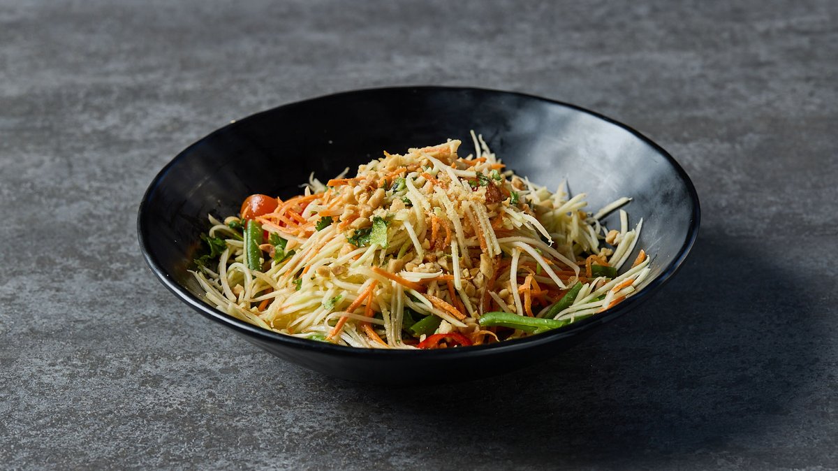 כרוב אדום ולבן, גזר, בצל ירוק, עגבניות שרי, כוסברה ושומשום שחור ברוטב בוטנים מקורמל