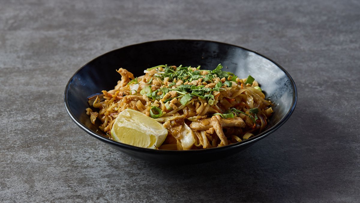 אטריות אורז מוקפצות עם עוף / טופו / בקר, נבטים, כרוב, בצל ירוק, גזר, כוסברה, נטיפי ביצה ובוטנים (קיימת אופציה ללא גלוטן)