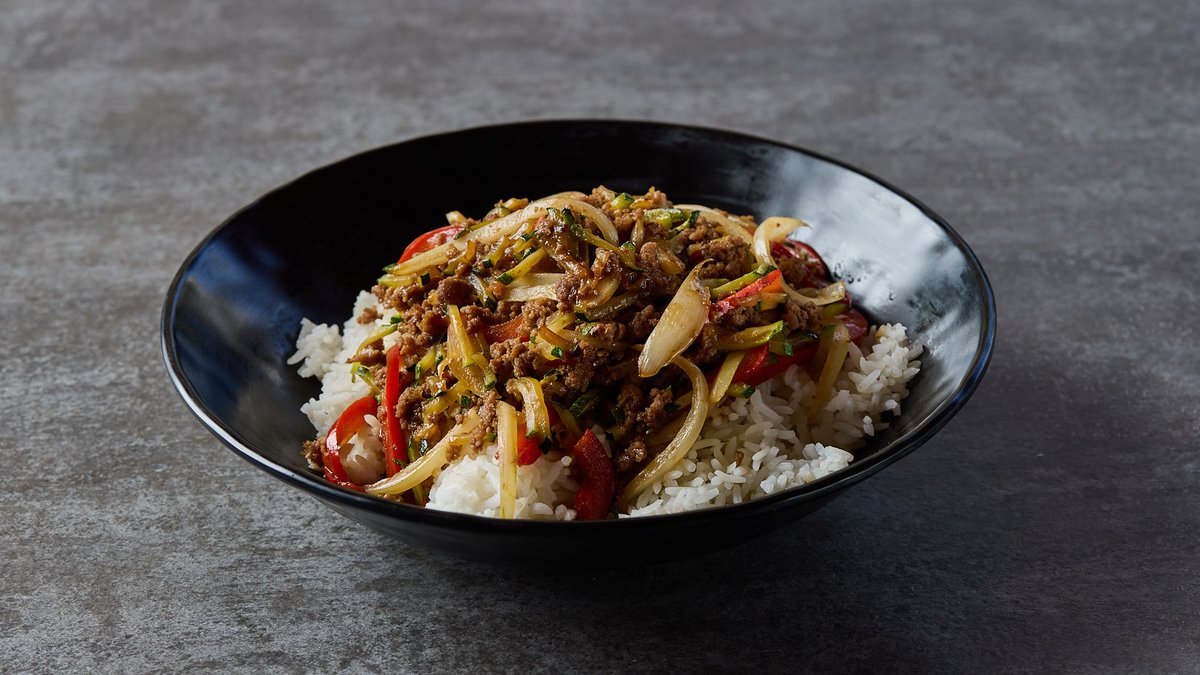 מצע של סטיקי רייס, אצות וואקמה, אבוקדו, גזר, פולי סויה, מלפפון ובצל בתוספת של סלמון מוקפצים בשמן שומשום ורוטב פונזו הדרים מתקתק