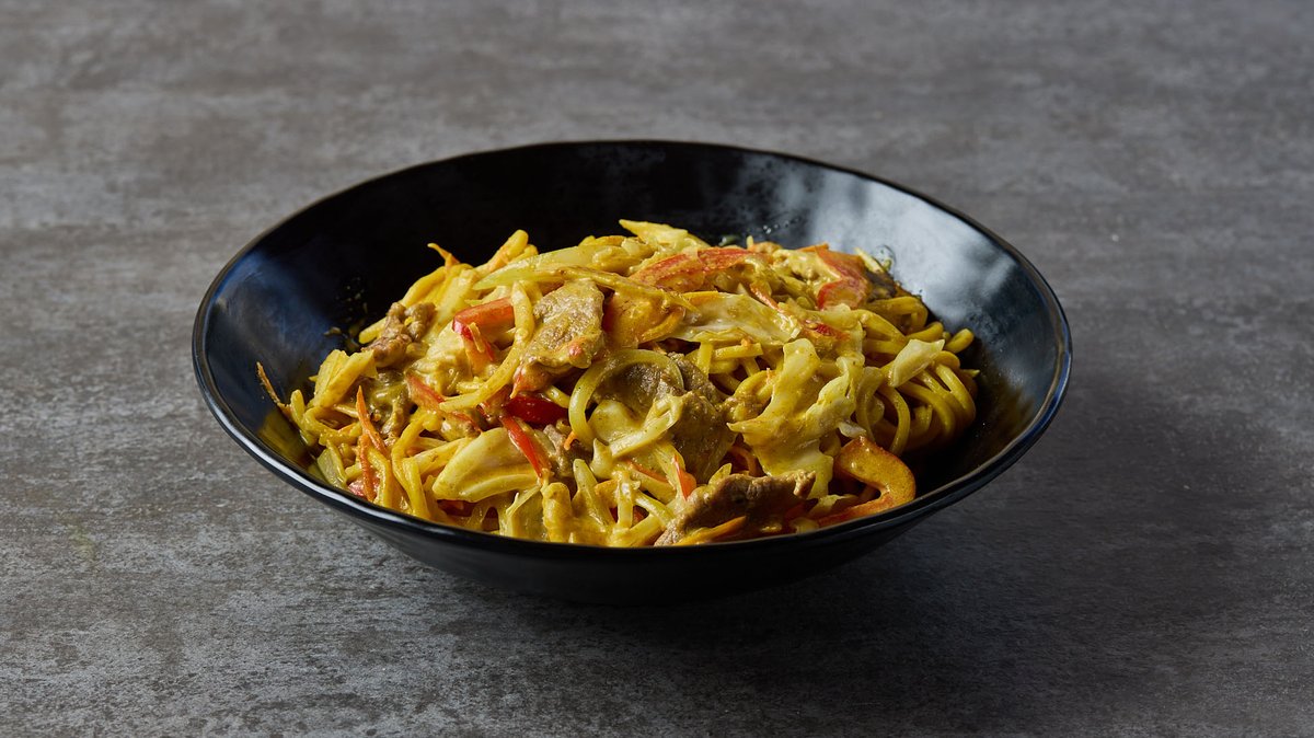 אטריות ביצים מוקפצות עם רוטב נוצ׳י, עם עוף / טופו, בצל, כרוב, גזר, גמבה, נבטים ונטיפי ביצה ברוטב