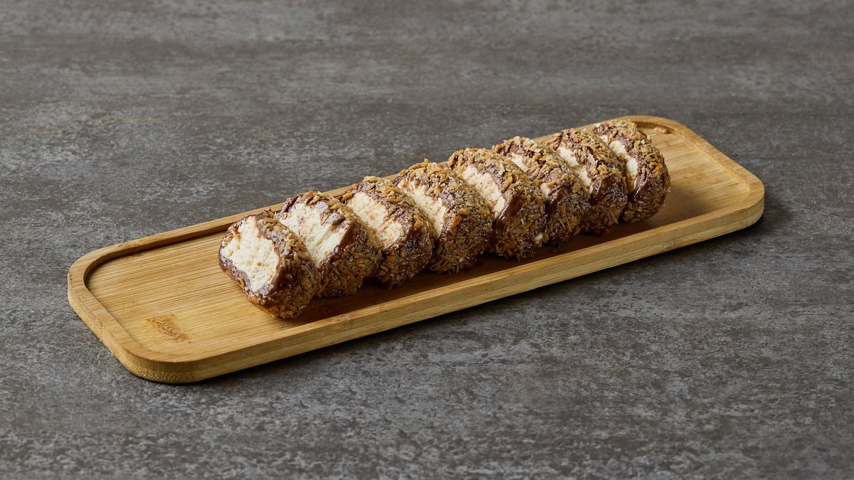 רול סושי מעטפת של טראפלס שוקולד במילוי קרם קוקוס עטוף בקוקוס קלוי