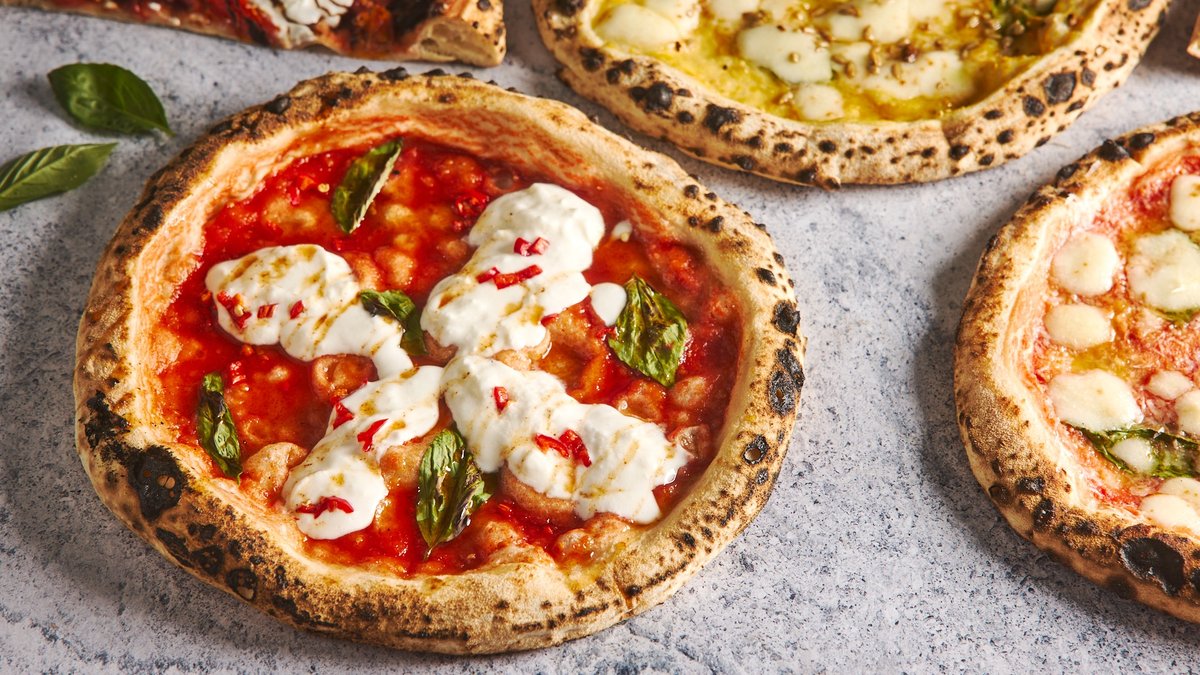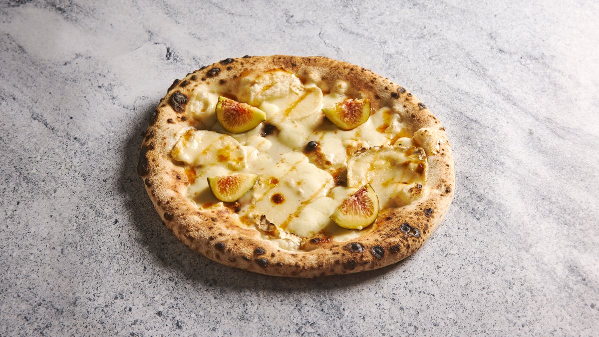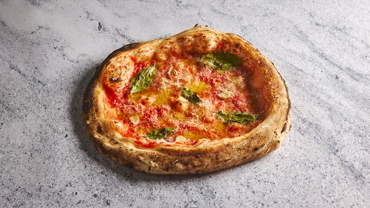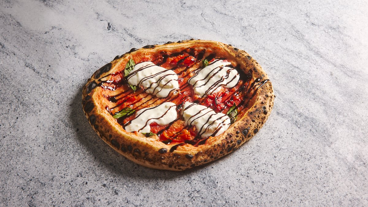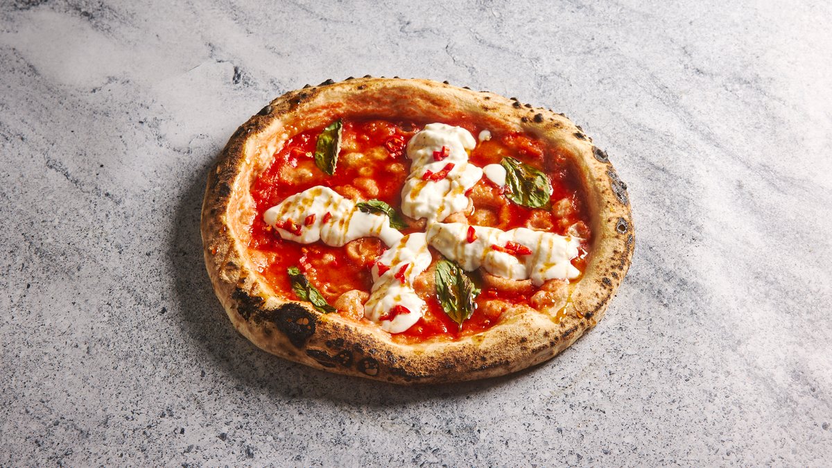 רוטב עגבניות סן מרזנו DOP, צ'ילי אדום, בזיליקום טרי, סטרטצ'לה, דבש צ'ילי-הגבינה מגיעה בצד