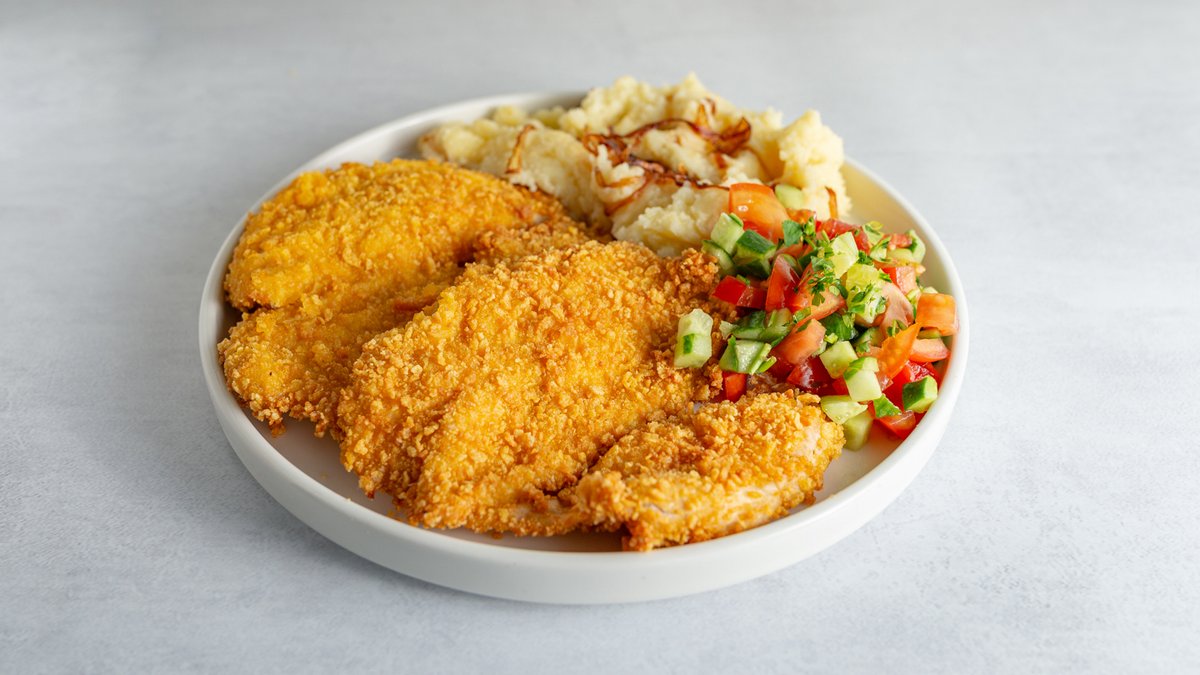 שניצל בציפוי קורנפלקס מוגש עם 2 תוספות לבחירה