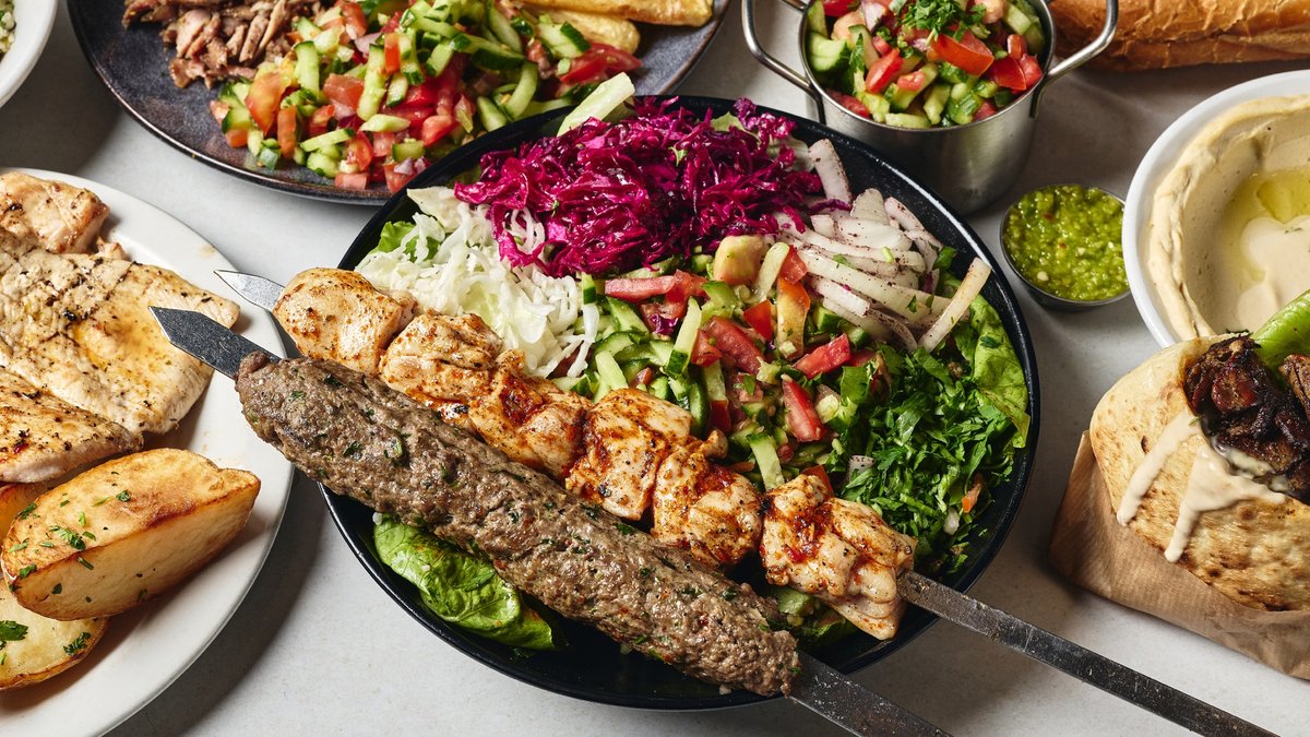שווארמה לבחירה עם סלטים וממרחים בלחם לבחירה