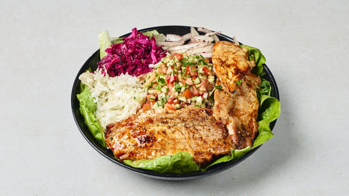 חזה עוף צרוב על הגריל עם סלטים וממרחים בלחם לבחירה
