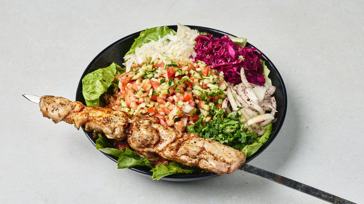 שיפוד פרגית עם סלטים וממרחים בלחם לבחירה